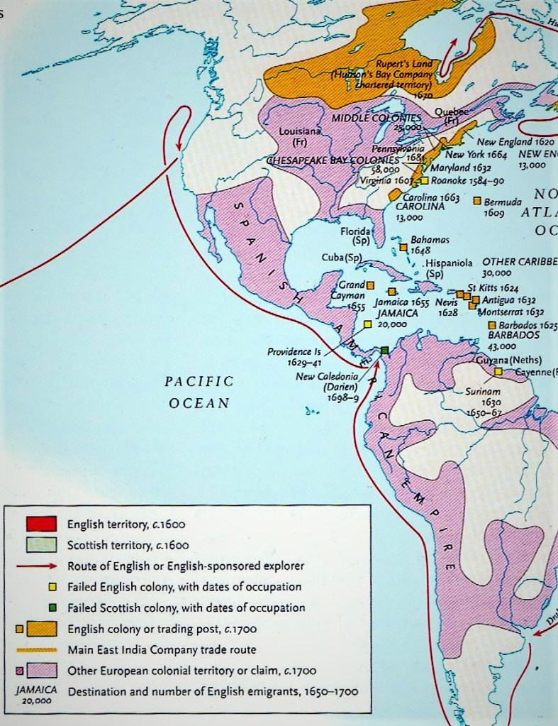 Against this economic background, by 1598, Bristol ships were making regular voyages not only to the Mediterranean ports but also to the Guinea Coast of Africa, the Atlantic Islands and North America. By 1605, the Bristol merchants felt strong enough to leave the London Company and petition for their own Charter which bore the names of over a hundred of them. It was many years before Bristol recovered fully from the effects of the war with Spain and those who had taken part in the action or suffered its consequences were long dead. One of the longer-term effects was the growth of the Atlantic trading system of which the Slave Trade and the institution of slavery in the Caribbean islands and North America formed an integral part. Perhaps ironically, given current controversies, Britain came late to the European Atlantic seabord’s imperial project. During the fifteenth and sixteenth centuries, while Spain and Portugal founded great empires spanning America, Africa and Asia, Britain’s rulers watched from the sidelines. John Cabot, Martin Frobisher and others with English sponsorship, in search of a northwest passage to the Indies, played a part in mapping what became Canada and helped open up abundant new fishing grounds in Newfoundland and the North Atlantic; further south, raiders and traders such as John Hawkins, Walter Raleigh and Francis Drake attacked the rich Spanish Indies. Yet, on the death of Elizabeth I in 1603, Britain had no permanent settlements outside Europe.
