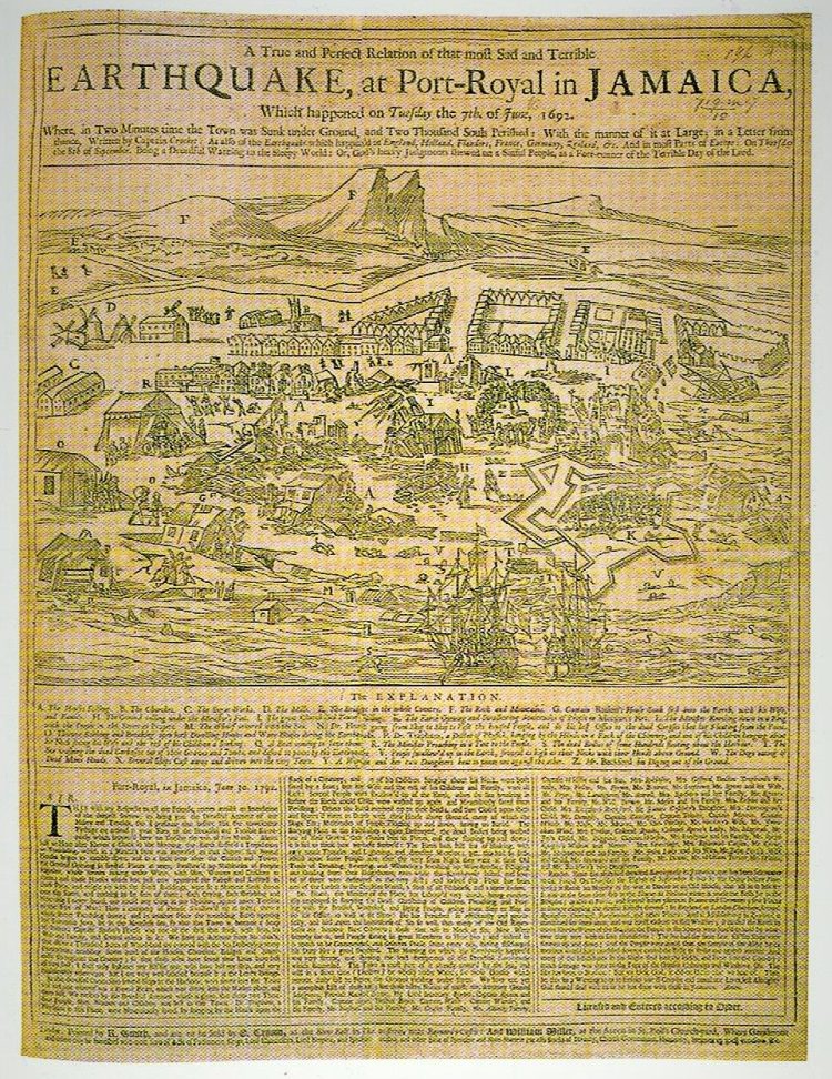 Meanwhile, privateering required little capital and provided the funds needed to ensure the infant colony’s survival. In the long run, peaceful contraband trade (especially a slave re-export trade), which also got underway in the 1660s, proved more important and more rewarding. Despite the treaty of Madrid in 1670, which promised peace and friendship between England and Spain in the Indies, privateers continued to refit their ships and sell their prizes at Port Royal throughout the late seventeenth century. The town, Henry Morgan and other famous adventurers, and notorious for its rowdy, dissolute, high-spending social life, acquired the reputation of being the wickedest city on earth. In 1692 a dramatic earthquake plunged most of its buildings underwater, beneath the harbour (see the contemporary newspaper below).