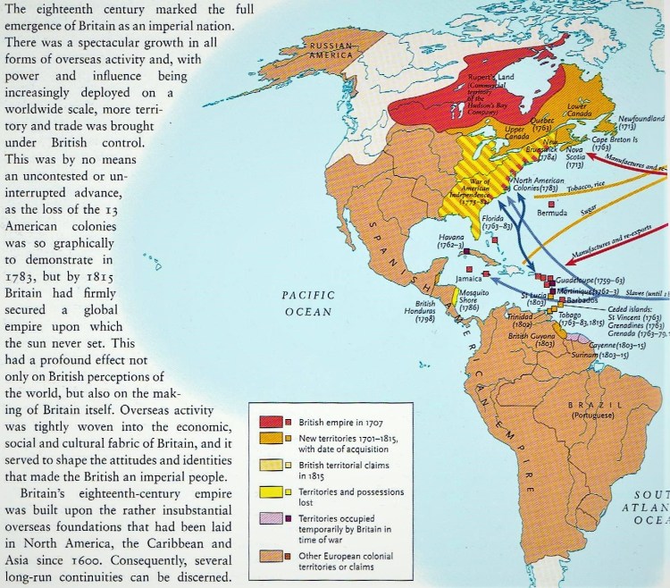 In the course of the eighteenth century, Britain became the most prosperous trading nation in the world. Its most serious commercial rival was France. At the beginning of the century, both countries had empires in North America and the West Indies and controlled trading posts in West Africa and India. For both countries, these possessions were vital to their prosperity and a bitter struggle developed between them as each country sought to ruin the other’s trading position by attacking its rival’s colonies. This struggle reached its height during the Seven Years’ War (1756-63). Britain emerged victorious from this, leaving it in control of the most important European overseas empire, with a population of half a million in its Thirteen colonies. Yet, emerging from the war, there was a new awareness of empire in which the effective hegemony of North America was especially entrancing. Imperial civil servants and ministers enjoyed a brief period of uninhibited inventiveness in the early 1760s as they planned a new and rosy future for the transatlantic colonies. The West Indies, firmly entrenched in a more effectively policed mercantilist system, would maximise the benefits of a ‘flourishing’ slave trade, provide a steady flow of tropical products, and form a valuable base for commercial incursions into the Spanish Empire. In contrast to those that Simon Schama calls the grovelling hacks and epicene toadies who lived off the leavings of the oligarchs there had emerged, from the 1730s,
