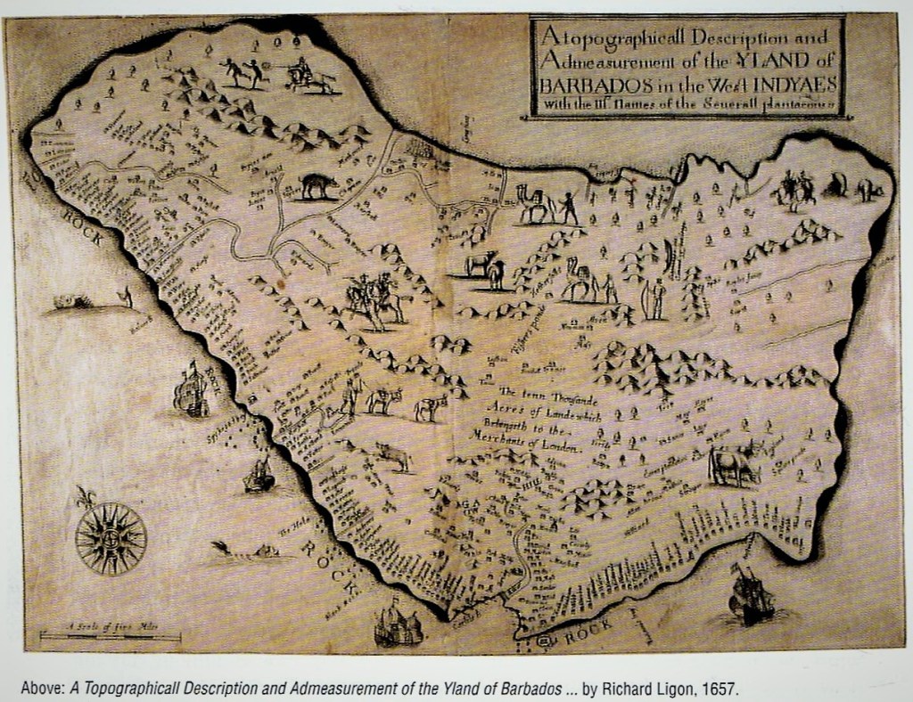 Barbados itself, barely twenty-one miles long, and, besides tourism, it is still almost wholly devoted to sugar production. The plantation boundaries remain almost the same as they always have. To the north of the capital Bridgetown, there stretches a long plain on which there are many plantations dating back to the 1640s. Much of the fertile ground is devoted to growing sugar cane. One of the plantations, called ‘Dukes’, about ten miles from Bridgetown, appeared on the earliest map of Barbados, published in 1657 (see below), and is still worked today for sugar by a white family who can trace their ancestry back to the settlement of the island. As early as 1655, Barbados was shipping 7,787 tons of sugar back to England, and there were already twenty thousand slaves on the island against twenty-three thousand whites, well over half of whom were indentured servants. When Richard Ligon arrived two years later, the well-founded reputation of Barbados as a ‘gold mine’ had already been established and he wrote of how …