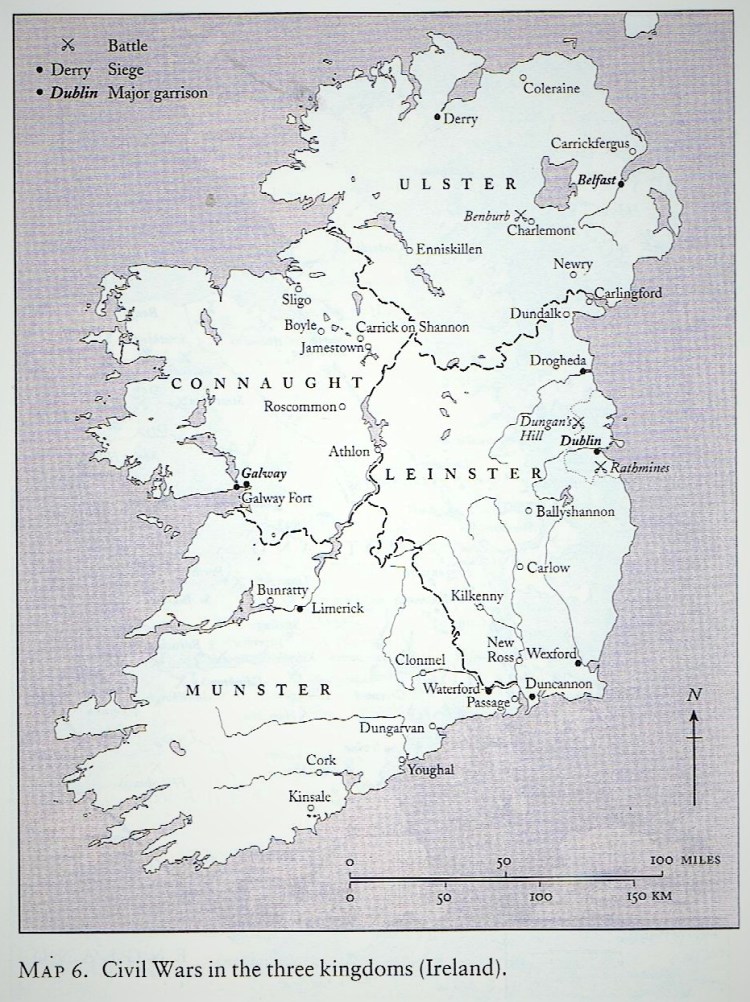 Following the repudiation of his treaty, Ormond felt justified in applying for redress to Westminster. He offered to surrender his office of Lord Lieutenant to parliament, which now realised that it must take full responsibility for England’s interests in Ireland and sent over a force of two thousand men under Colonel Michael Jones. They landed in Dublin in June; Ormond handed over his command to Jones and signed a treaty with the parliamentary commissioners. By the terms of this, all protestants were to be secured in their estates, loyal catholics were to be favourably treated, and all noblemen, gentlemen and officers who wished to leave Ireland with him were free to do so. He sought an interview with the king at Hampton Court as soon as he arrived back in London, and recieved full royal approval for his conduct in Ireland. Nevertheless, his capitulation divided his Old English adherents, some of them joining the army of Leinster which set out again to lay siege to Dublin. But Colonel Jones stood in his way, holding a good position on Dungan’s Hill near Trim. The Confederates could not supply the Leinster men during a protracted campaign, so they attacked on 8th August. Jones’s men were no raw recruits, and only lately disbanded from the parliamentary army, so the Irish troops were utterly routed, leaving Leinster so vulnerable that O’Neill’s dreaded Ulstermen had to be brought in to help protect the province. This led to a further worsening of relations between the Old English moderates and the ultra-Catholic militants. A full-scale civil war had broken out between the protestants in the south and the Confederates, with the former, led by Murrough O’Brien, taking one castle after another throughout the summer.