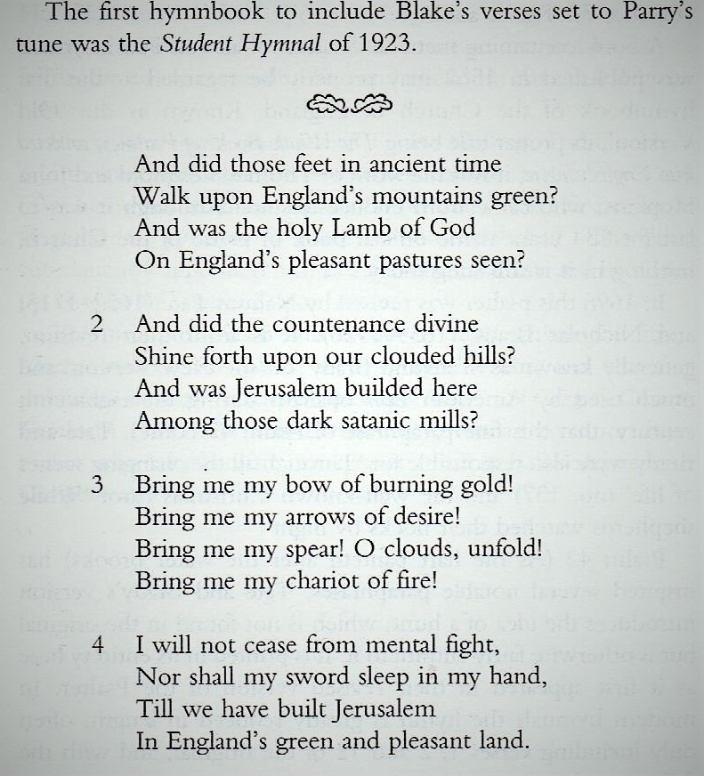 The theme of Blake’s poem is linked to the Book of Revelation (3: 12 and 21: 2) describing a Second Coming, wherein Jesus establishes a New Jerusalem. Churches in general, and the Church of England in particular, have therefore long used Jerusalem as a metaphor for Heaven, a place of universal love and peace. In the most common interpretation of the poem, Blake implies that a visit by Jesus would briefly have created heaven in England, in contrast to the “dark Satanic Mills” of the Industrial Revolution. Blake’s poem asks four questions rather than asserting the historical truth of Jesus’s visit. Thus the poem merely wonders if there had been a divine visit when there was briefly heaven in England. The second verse is interpreted as an exhortation to create an ideal society in England, whether or not there was a divine visit. ‘Jerusalem’ later became a patriotic anthem, even a second national anthem, set to music by Sir Hubert Parry during the First World War. The hymn was first associated with meetings of a crusading movement, ‘Fight for the Right’, set up to build a better Britain for the millions of soldiers who would return home after the war. It was also sung at a meeting held in March 1918 at the Royal Albert Hall to celebrate the granting of votes to women. Millicent Fawcett, the leading Suffragist, agreed with Parry that it would be made the ‘Women Voters’ Hymn’.