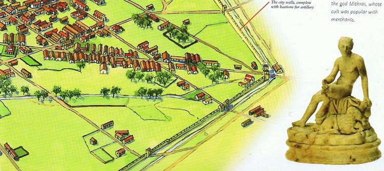 The extent of the destruction carried out by Boudicca’s warriors helps us to understand the depth of hatred and mistrust which existed towards the Romans when Aristobulus was killed two years earlier. At Camulodunum (Colchester), the Temple was restored and important Trinovantes were required to serve every year as its priests, paying for the rites and sacrifices associated with the imperial cult. A model of it (pictured above) stands in the Museum in the Norman keep of the castle on part of the podium of the temple. In front of it stood the altar flanked by statues within an impressive courtyard surrounding the precinct, which covered five acres. The importation of this state religion was a most important event in the religious and social consciousness of the inhabitants of the British Isles since the Neolithic period. First of all, because it was a deliberately supranational religion, including all the tribes and nations of the Empire from Parthia to the ‘client kingdoms’ of the Picts in north-eastern Britain. Secondly, because it introduced the concept of the ‘polis’, the city into the islands as provincial reflectors of the great imperial capital itself. Every township with its forum and temples became the centre of religious and administrative activity and the focus of ‘civilization’. The change of emphasis remains in the international Latinate words ‘civilization’ and ‘paganism’ referring to the culture of the civitas and the pagus, the countryside, with its narrower beliefs and superstitions. Verulamium (St. Alban’s) was soon rebuilt and enlarged, acquiring a forum and basilica, temples and a theatre.
