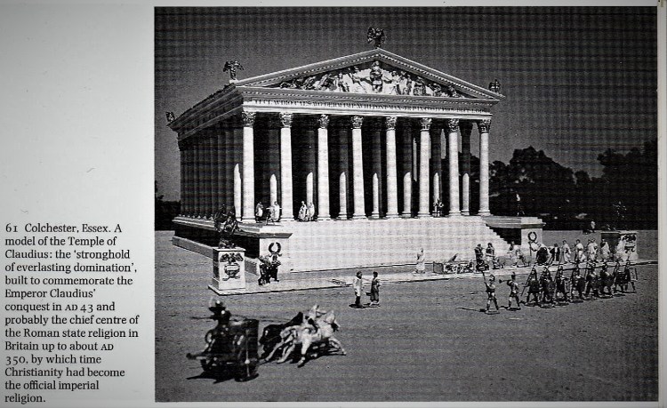By AD 49-50, Camulodunum (Colchester) had become a ‘colonia’ or town settled by ex-soldiers on the conquered territory and the authorities built a vast temple there dedicated to the Emperor. Tacitus described it as the ‘stronghold of everlasting domination’; its size and splendour brought remark even at Rome and its presence as the centre of the Roman state religion centred on the numen or divine spirit of the Emperor was one of the many resentments that caused the rebellion led by Boudicca, queen of the Iceni, in AD 60. Although they adopted much of the Roman lifestyle and substance, many of the tribes who surrendered at the conquest and after Caractacus’s campaign of AD 51 still looked to the day when their freedom would be restored. At the very least they expected Rome, in return for their allegiance, to preserve their territories and respect the dignity of their tribal rulers and the Druidic religion. In their dealings with the Iceni and the Trinovantes of Eastern Britain, the Roman administration fell disastrously short of these expectations. When Presatagus, ‘king’ of the Iceni died, probably in 59 AD, the terms of his will made the emperor Nero co-heir with the king’s two daughters. To assess the extent of the estate due to the emperor, an inventory of Prasutagus’s possessions and land should have been taken. Instead, the local Roman governors began to plunder the whole territory of the Iceni. When the royal family resisted this pillage, the king’s widow, Boudicca, was flogged and her daughters raped.