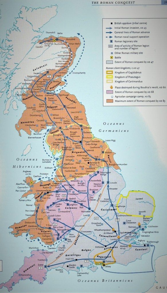 While Claudius was savouring the defeat of the tribes in the south-east, Vespasian began an advance into the south-west. This was the best-documented advance, the principal target of which was Caractacus himself. It took thirty battles against the two warlike tribes, the Durotriges of present-day Dorset and Somerset and the Dumnonii of present-day Devon and Cornwall, to subdue the West. Vespasian’s progress was marked by a series of violent if brief struggles for the possession of hillforts. Substantial gains were made, including the surrender of twenty hillforts, one of them being Maiden Camp (pictured above), where a hastily dug war cemetery provides an insight into the ferocity of the fighting. But Caractacus remained elusive, evidently escaping into Cambria. It is probable that Vespasian reached Exeter and his campaign may have extended into what later became Cornwall. There is no literary evidence for the activities of the remaining legions in Britain, but the archaeological evidence suggests that the XXth remained at Verulamium (Colchester) to establish a firm base and act as a strategic reserve. The Roman road known as the ‘Fosse Way’, running from Topsham near Exeter through Leicester to Lincoln provided an effective line of communication through a broad frontier zone stretching from the River Severn to the Humber. Thus, in AD 47, Publius Ostorius Scapula inherited a considerable military and administrative achievement as the new governor of Britain. A substantial part of the island had been occupied as a province of Rome and for the moment at least the occupation appeared reasonably secure.
