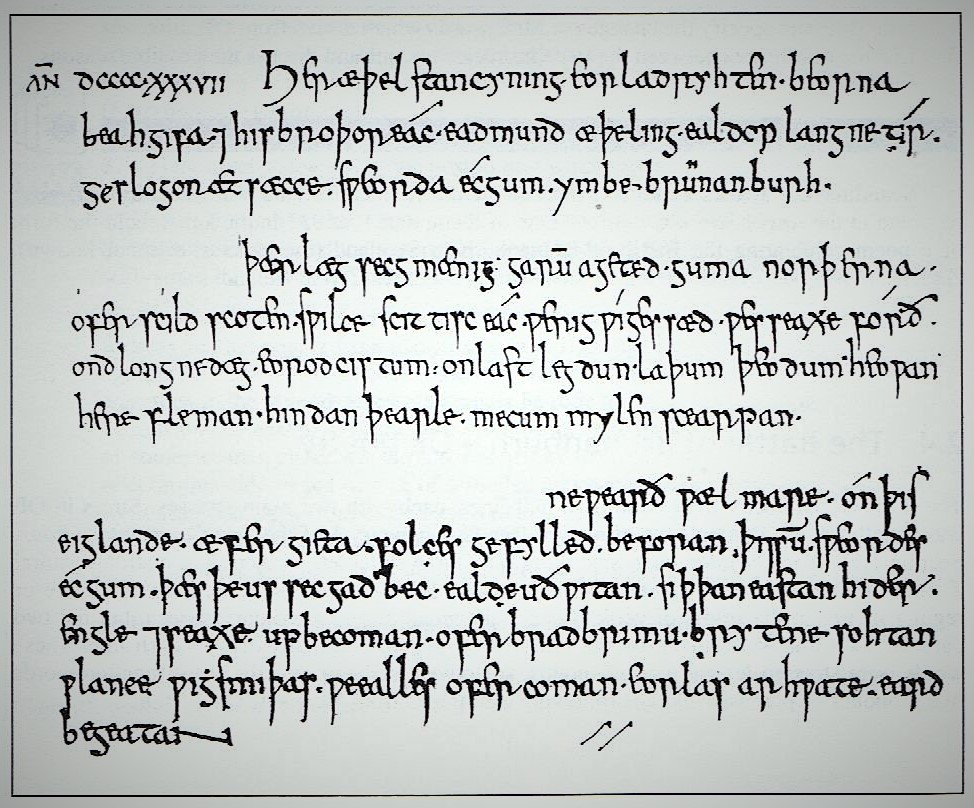 937. Here athelstan king, of -earls lord, of men ring-giver & his brother also. edmund prince. life long honour. won in battle. of swords with edges. by burnanburh.