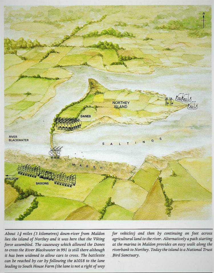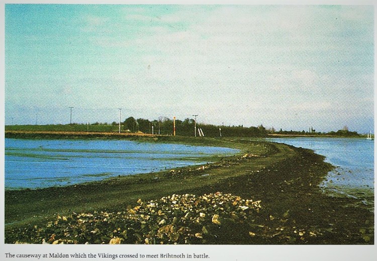 During the reign of Ethelred the Unready (978-1016; his nick-name implied that he was ill-advised rather personally lazy and unprepared), the Danes (now united under a king called Sweyn Forkbeard) renewed their attacks upon England. These began with fresh Viking raids in 981, which probed against centres of prosperity and population and yielded rich spoils in the form of Saxon treasure and slaves. Although the numbers of ships and raiders involved had been relatively few their attacks had been wide-ranging. Cheshire, Devon, Cornwall and Dorset had been particularly hard hit; Southampton, London, and the monastery at Padstow had been sacked. These successful ventures must have encouraged the massive expedition of 991 when ninety-three boat-loads of them anchored first off the Kent coast and then off Suffolk, where they landed an army which burnt Ipswich to the ground before marching to Maldon in Essex, where they met the English forces in what has been described as the most momentous battle of the Anglo-Saxon period. The entry for 991 in the Anglo-Saxon Chronicle provides a bare outline of events surrounding the battle. Olaf, King of Norway, joined them. We are told that Olaf’s ships arrived at Folkestone…