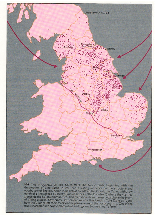 Before the arrival of the Danes, Old English, like most European languages at that time, was a strongly inflected language. Common words like “king” or “stone” relied on word-endings to convey a meaning for which we now use prepositions like “to”, “with”, and “from”. In Old English, the “king” is se cyning, “to the king” is thaem cyninge. In Old English, they said they said one stan (stone), two stanas (stones). The simplification of English by the Danes helped to eliminate these word-endings so that today we simply use the same plurals for most native English words as in stone(s) and king(s). Apart from the obvious placename evidence mentioned above, the impact of Old Norse on the English language is hard to evaluate with much accuracy, precisely because the two languages were so similar. Nine hundred words, including such ‘high frequency’ words as get, hit, leg, low, root, skin, same, want and wrong, are certainly of Scandinavian origin and typically plain-syllabled. Words beginning with /sk/ like sky are Norse. There are probably hundreds more we cannot account for exactly, and in the old territory of the Danelaw in the North East and East Midlands of England there are thousands of Old Norse borrowings, words like beck (stream), laithe (barn) and garth (yard) survive in regional dialects. In many cases, these borrowings stood alongside their English equivalents. The Norse skirt originally meant the same as the English shirt. You can ‘rear’ (OE) or ‘raise’ (ON) a child. Other near-synonyms include ‘wish/want’, ‘craft/skill’, ‘hide/skin’. Thanks to the Danes, English was given another dimension, more light and shade, greater variety.