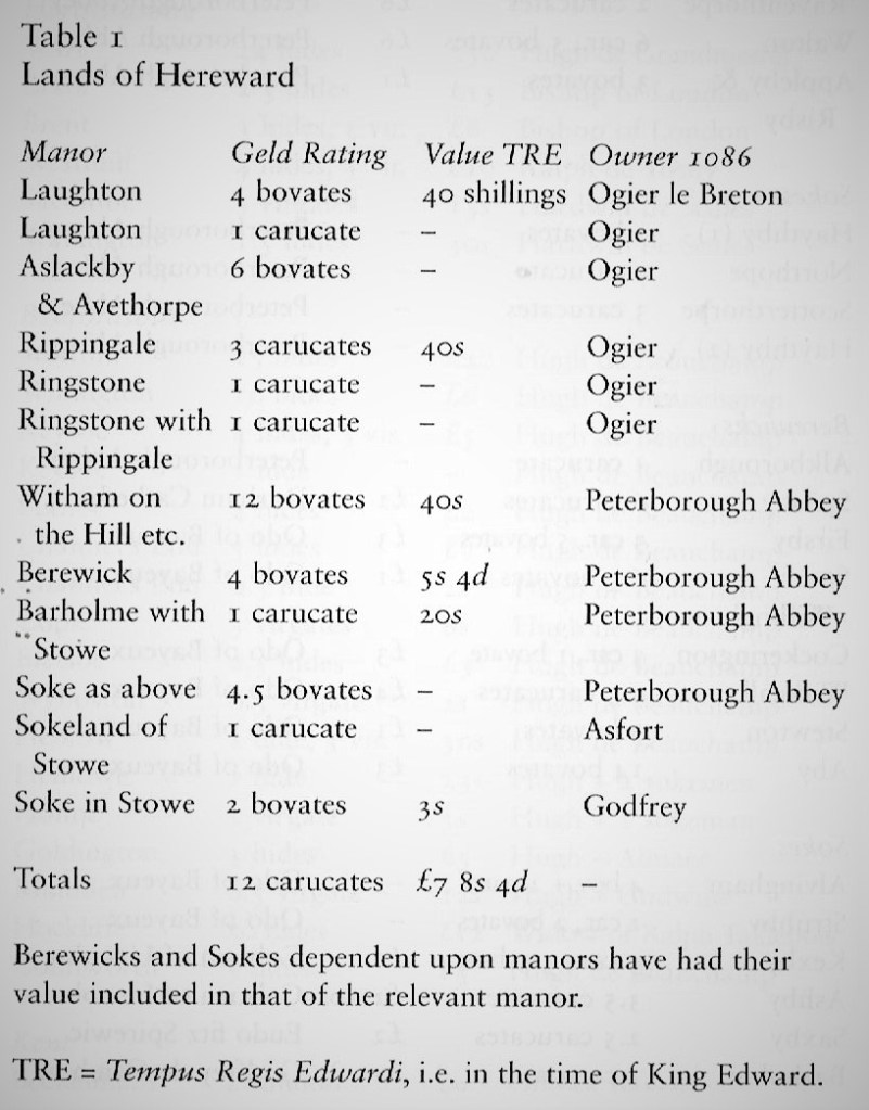 In the Danelaw before the Conquest, and particularly in Lincolnshire, society possessed a high degree of freedom. The land was held by thegns and sokemen with free disposal of their estates. They performed service in the ‘Wapentake’, (the local court) in person. ‘Sake’ and ‘soke’ implied a whole range of judicial dues, food rents, labour services, all reserved for the holer of the ‘soke’, the overlord, who was answerable directly to the king. Sake and soke were also held together with toll and team, the right to receive payment from the sale of goods within an estate or to hold a court to settle disputes over cattle or goods. They were also entitled to carry out infangenetheof, the right to hang a thief caught red-handed with stolen goods. The possession of soke and sake was also indicative of the ownership of ‘Bookland’, held through the existence of a landbook or charter. Since they were therefore seen as overlords of lesser men, these king’s thegns were considered by the makers of the Domesday Book to be the designated predecessors of the new Norman owners, and several are listed as conferring the title on their successors. King’s thegns, holding groups of dependent manors were seen by the Normans to resemble lords holding by barony; they could be personally summoned to the ‘fyrd’ and be held responsible for the performance of military service by his knights. It could be said that a ‘fief’- honoured baron was a king’s thegn in all but name. Whether such overlordship was common is still a matter of debate, with some maintaining that there were many more than those mentioned in Domesday, but they must have existed since it was from such men that the Norman successors derived their title to land.