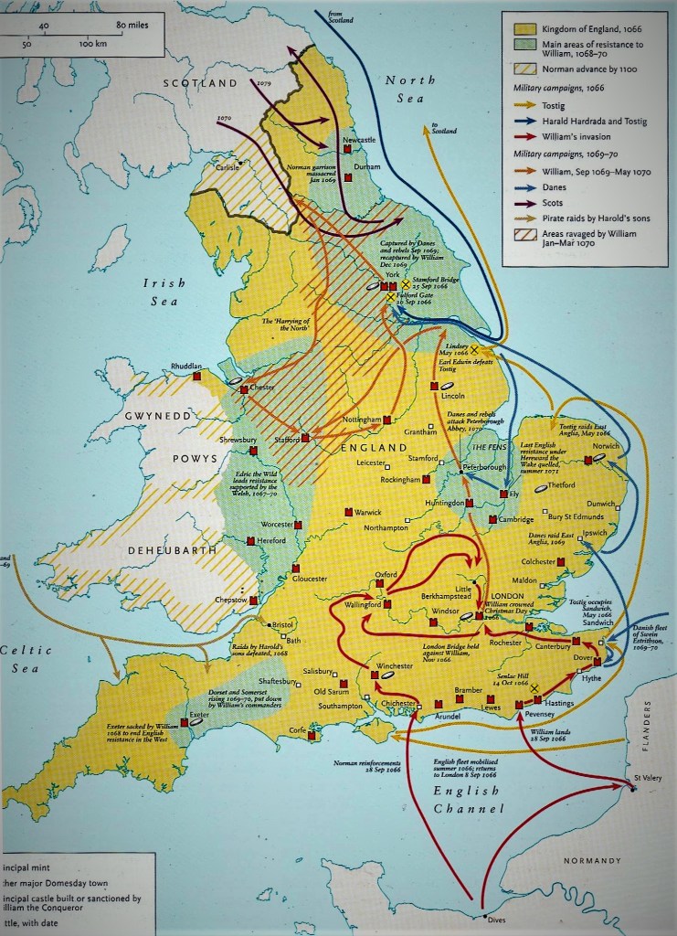 In the summer of 1066 England faced invasion on two fronts – by the Norwegian king, Harald Hardrada, and by William, Duke of Normandy, both of whom claimed the throne. After Hardrada’s defeat at Stamford Bridge near York, William’s victory at Hastings and Harold’s death, William proceeded to ravage the South East. The Anglo-Danish rebellions of 1068-70 were ruthlessly suppressed, especially through his ‘Harrying of the North’.