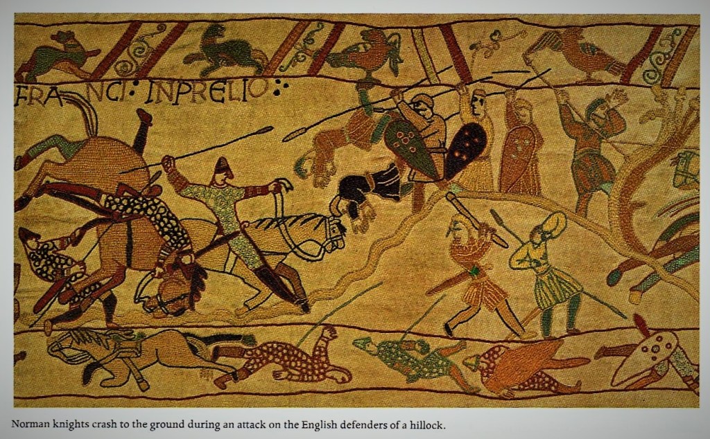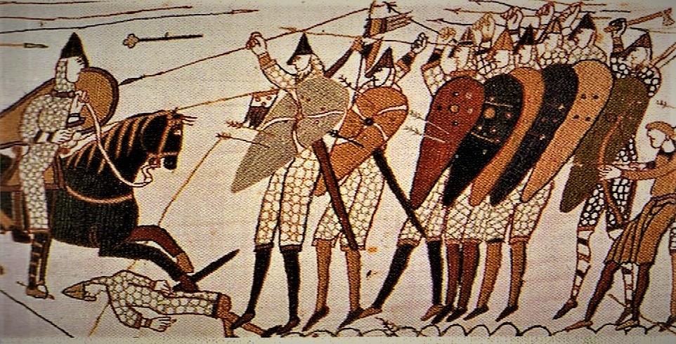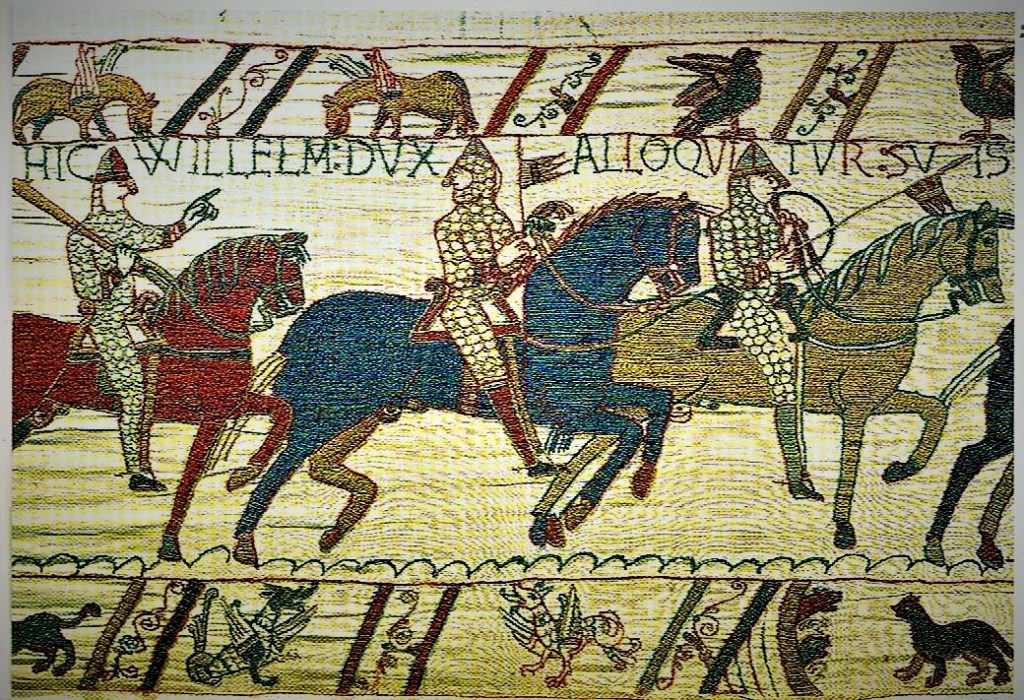 The story of the Norman ‘takeover’ of England has been told very often, most vividly in one of the earliest accounts in the form of Queen Matilda’s tapestry, still kept in Bayeux, which gives it the name it is better known by. French legend maintained the tapestry was commissioned and created by Queen Matilda, William the Conqueror’s wife, and her ladies-in-waiting. Indeed, in France, it is occasionally known as “La Tapisserie de la Reine Mathilde” (Tapestry of Queen Matilda). But it is now believed that Odo, William’s half-brother, commissioned the tapestry, and if so it was probably designed and constructed in England by Anglo-Saxon artists (Odo’s main power base being by then in Kent); the Latin text contains hints of Anglo-Saxon; other embroideries originate from England at this time, and the vegetable dyes can be found in cloth traditionally woven there. The tapestry was originally hung around the walls of a room but is now displayed around a large central case. It is not really a tapestry but an embroidery, for which Anglo-Saxon women were well-known, since it was made by English ladies. In some ways, it reflects that dual origin: in outline it is comic-strip-cartoon propaganda for William, supporting his claim to be the legitimate King of England, but it can also be read as an epic tragedy, the story of the downfall of Harold after he broke the oath William had extracted from him. It depicts the events leading up to the Norman conquest of England concerning William, Duke of Normandy, and Harold, Earl of Wessex, later King of England, and culminating in the Battle of Hastings (October 1066). It is thought to date to the late 11th century, within a few years of the battle.