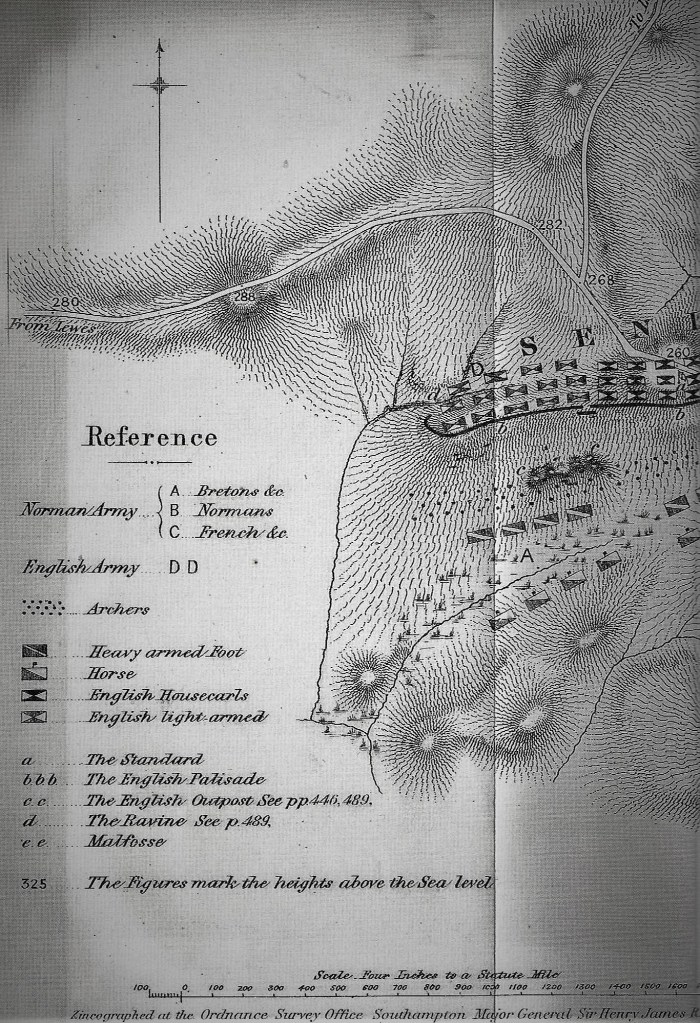 William’s invasion was his response to the personal and political challenge inherent in Harold’s assumption of the English Crown, an act which not only cut across Edward the Confessor’s promise of 1051 that William should be his heir, but also a violation of the oath of fealty to William extracted from Harold at Bonneville-sur-Torques in 1064. Harold’s coup d’état against the Anglo-Norman élite left William with no choice but to take up arms. This was no knee-jerk reaction, however, but a carefullly-prepared invasion on a massive scale. It began with a three-fold diplomatic initiative designed to enlist the support of his vassals, to foster disunity among his enemies in France and Europe more widely, and to gain the support of the Papacy and popular opinion in Christendom. The success of this propaganda campaign was matched by the speed and organisation of his military and and naval preparations. The total invasion fleet may have numbered three thousand ships, which transported two thousand horses and about seven thousand fighting men. The uncertainties of the coming campaign dictated the need for a safe and large anchorage such as that at Hastings, so William moved his troops and ships to the port, ordered the construction of new defences, and proceeded to waste the the surrounding countryside. It was vital for William’s plans that Harold should attack at the earliest opportunity. Although delay would have increased Harold’s strength and attenuated William’s, the English king, possibly driven by the need to defend his ‘domain’ against Norman marauding, decided to confront the enemy at the first opportunity. When he marched from London on 11 October, Harold might have hoped to surprise the Norman army as he had the Scandinavian one at Stamford. The English halted at what is now the town of Battle during the night of 13-14 October after his second march, this time of sixty miles, which had taken a tremendous toll on the infantry.