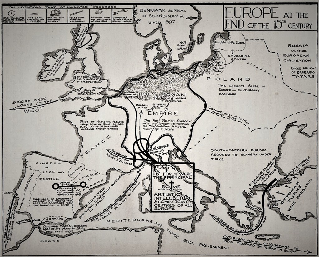 Remarkable changes occurred in Europe in the second half of the fifteenth century and sixteenth century; so far-reaching were they that historians considered to mark the transition to the modern period. But it’s important to remember that this distinction between medieval and modern times is simply a device to help historians define and develop their study’s scope. In reality, there was no break in the continuity of civilisation in the fifteenth century, either in its middle or later years. Throughout the Middle Ages in Europe, men and women, primarily inspired by their religious beliefs, had been building European civilisation, one brick at a time. We also need to be careful not to apply too much historical hindsight to a perceived transition period or to see a pattern of inevitability in the random events of the arbitrary period between 1480 and 1530. The triumph of the nation-state, whose beginnings are now conventionally traced to the start of the sixteenth century, would have seemed improbable to someone born in its first decade. Moreover, the most prosperous states appeared to be multi-national ones, like the Swiss Confederation or the ‘universal monarchy’ built up by Charles V, which encompassed Spain, the Netherlands and the Austrian dominions of the Habsburgs. By contrast, the territorial kingdoms to the west, such as France and Spain, had seen their economic position badly affected by prolonged warfare and civil strife.