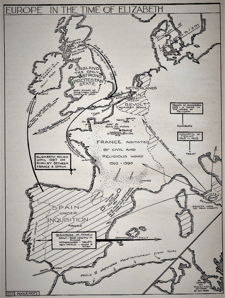 … Elizabeth could not allow Spain to destroy England’s old enemy France. Yet, equally, she could not afford to destroy her new enemy, Spain. For England could live … in a world of two Leviathans; she could not live where there was but one … A restored France, that was not matched by a strong France. For the same reasons, England must defend Dutch liberties, but would not fight for their independence. An independent Netherlands would be too weak to withstand a restored France and, if they became French too dangerous a preponderance. … but there seems no real doubt that her principal war aim , the principal cause of the conflict with Spain, was her determination to restore all the Netherlands provinces to their ancient liberties and privileges … and to secure the Netherlands Protestants ‘their liberty and exercise of the Christian religion.’ But nominally Spanish they must remain.