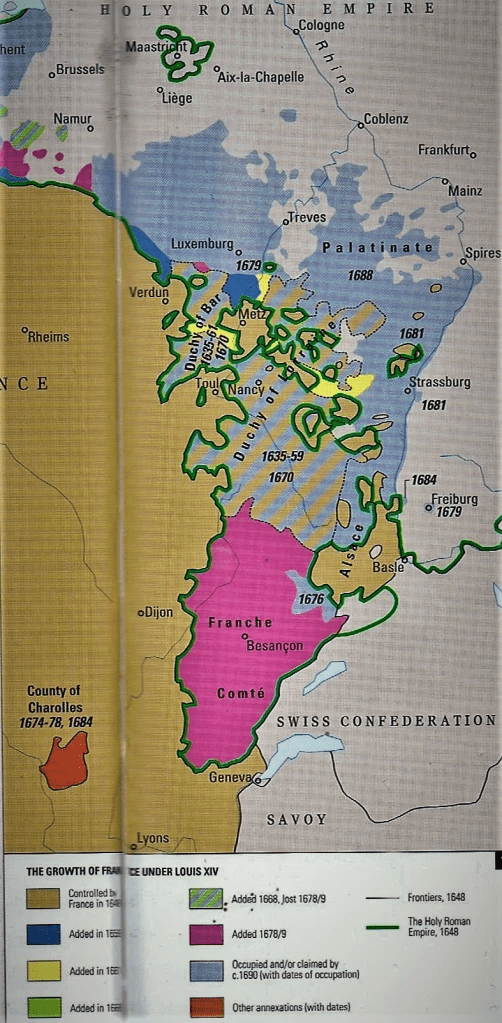 After 1648, the most significant change in the balance of power in western Europe was the emergence of France as the predominant state. Following the Treaty of the Pyrenees in 1659, Spain lost all vestiges of its previously-held power and pre-eminent position. After the death of Mazarin in 1661, Louis XIV (1643-1715) pursued a policy of diplomatic aggression. But it was only in 1667 that he first went to war. Claiming parts of the Spanish Netherlands by virtue of his Habsburg wife’s rights as the elder sister of the new Spanish King, Carlos II, Louis’ troops quickly occupied the territory. Peace in 1668 gave France twelve fortresses along its borders with the Spanish Netherlands to add to Dunkirk, bought from England in 1662. Then, in 1672, the French king turned on his former Dutch allies. They were saved from defeat only by opening up the dykes as they had done a century earlier in their war of independence with the Spanish. Although the Dutch survived until peace in 1678 and even recovered Maastricht by the Treaty of Nijmegen (1678-9), it was their weak Spanish allies who paid the price, as the map below shows: