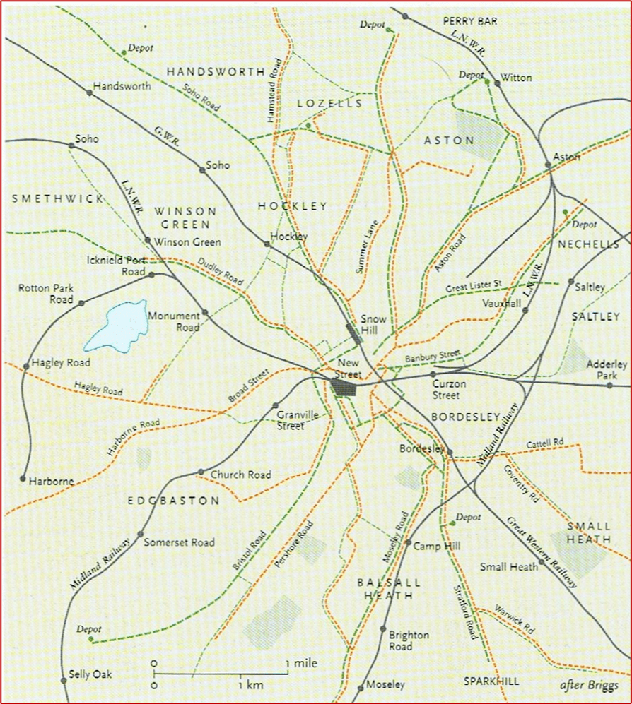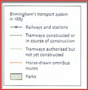 Birmingham’s diverse industrial base made it a serious rival to Manchester as England’s second city in the later nineteenth century. The Corporation gained a reputation for its municipal enterprise and public works, including one of the country’s most extensive urban tramway systems. On the map above of Birmingham in 1885, you can see how the tramways were at first drawn by horses, then gradually replaced by motorised trams by the end of the century. The grimy, haphazard industrial inner city was soon surrounded by a ring of public parks in the rapidly expanding suburbs. Despite its reputation as a factory city, Birmingham has always had more trees than people.
