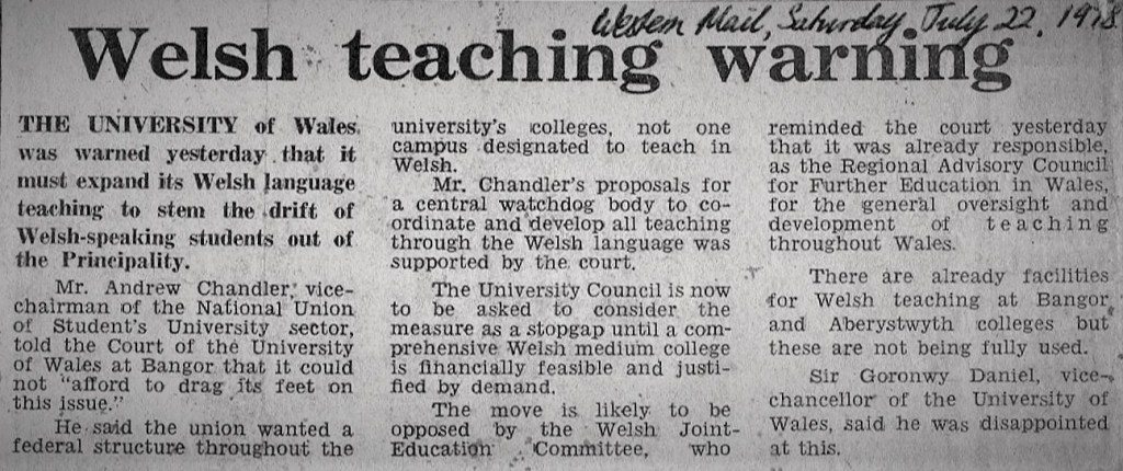 In July 1978, a week after my graduation ceremony, I also took up my role as Vice-Chairman of UCMC (NUS Wales). I found myself, once again, addressing assembled academics and dignatories in Neuadd John Pritchard. This time, for the first time, this was at the University of Wales Court of Governors, the assembly for the national federal institution. I put forward a proposal for a federal Coleg Cymraeg with a central Welsh Medium Teaching Board to coordinate the development of courses in Welsh beyond Aberystwyth and Bangor. This was reported the next day in the Western Mail: