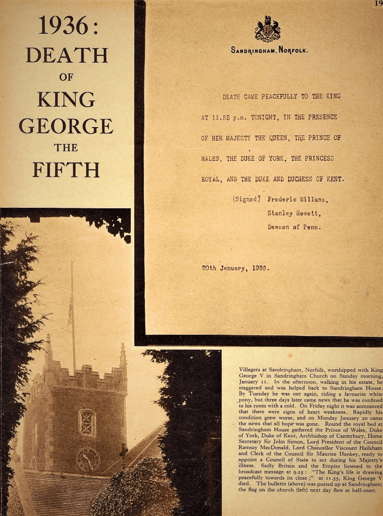 It seems this was done to prevent further suffering for the patient and strain on the family but also to ensure that the death could be announced in the morning edition of The Times rather than ‘the less appropriate evening journals.’ The newspaper was advised to hold its edition by Dawson’s wife in London, whom the doctor had tipped off by telephone. It duly obliged and was rewarded when A Peaceful Ending at Midnight was rolled off as its headline the next morning. At five minutes to midnight, King George died. Queen Mary turned from his bedside to kiss the hand of the new Sovereign, her son David, now to be known as Edward VIII.