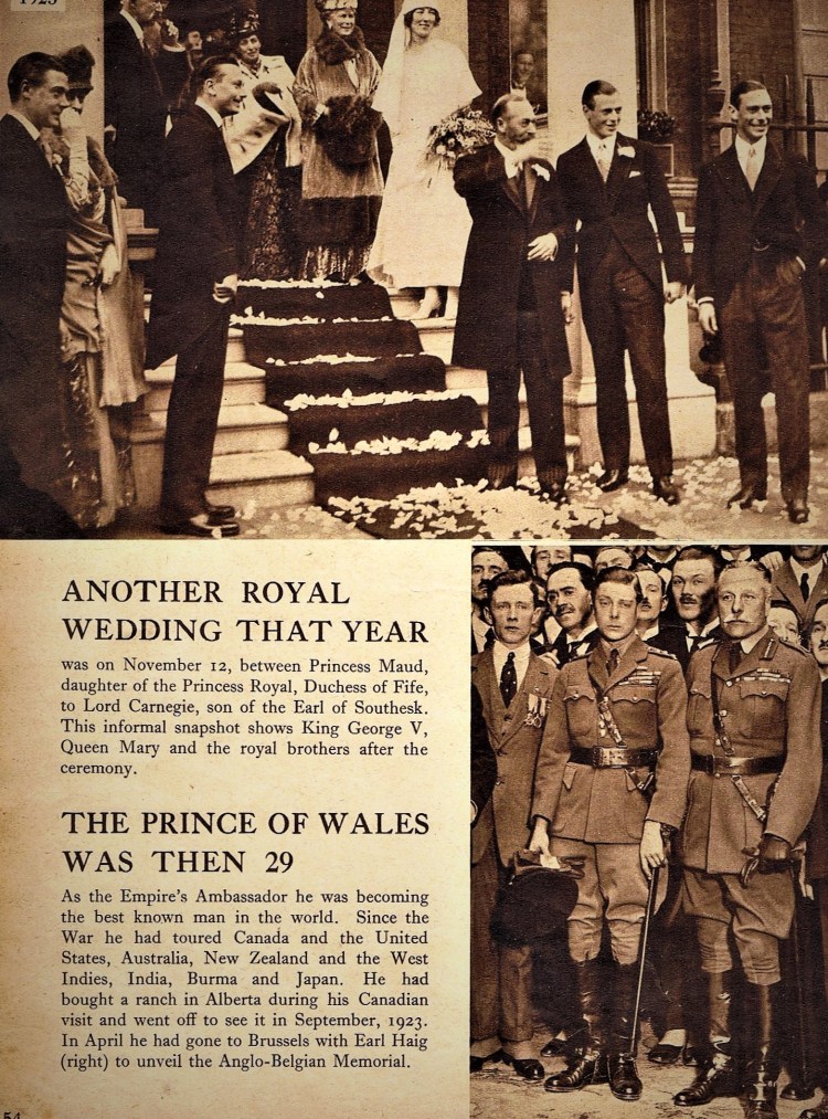 The journeys of the Prince of Wales, and his powers of charming every class, have brought the royal life into the kindliest contact with their own. When on Christmas Day in recent years the the King has spoken to all his people, his wave-length has been subtly attuned to their hearts. He is not Sovereign nor symbol, but the Head of the Family, who summons his household round the hearth, and commends it to “the Father of Whom every family in heaven or on earth is named”.