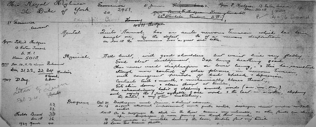 ‘The outstanding feature of the two years he has spent with me is the enormous capacity for work his Royal Highness possesses. When he first began to improve, he visualised what perfect speech was and nothing short of that ideal is going to satisfy him. For two years, he has never missed an appointment with me, a record of which he can be justly proud. He realized that the will to be cured was not enough but that it called for grit, hard work and self-sacrifice, all of which he gave ungrudgingly. Now he is “come to his kingdom” of content and confidence in diction.’