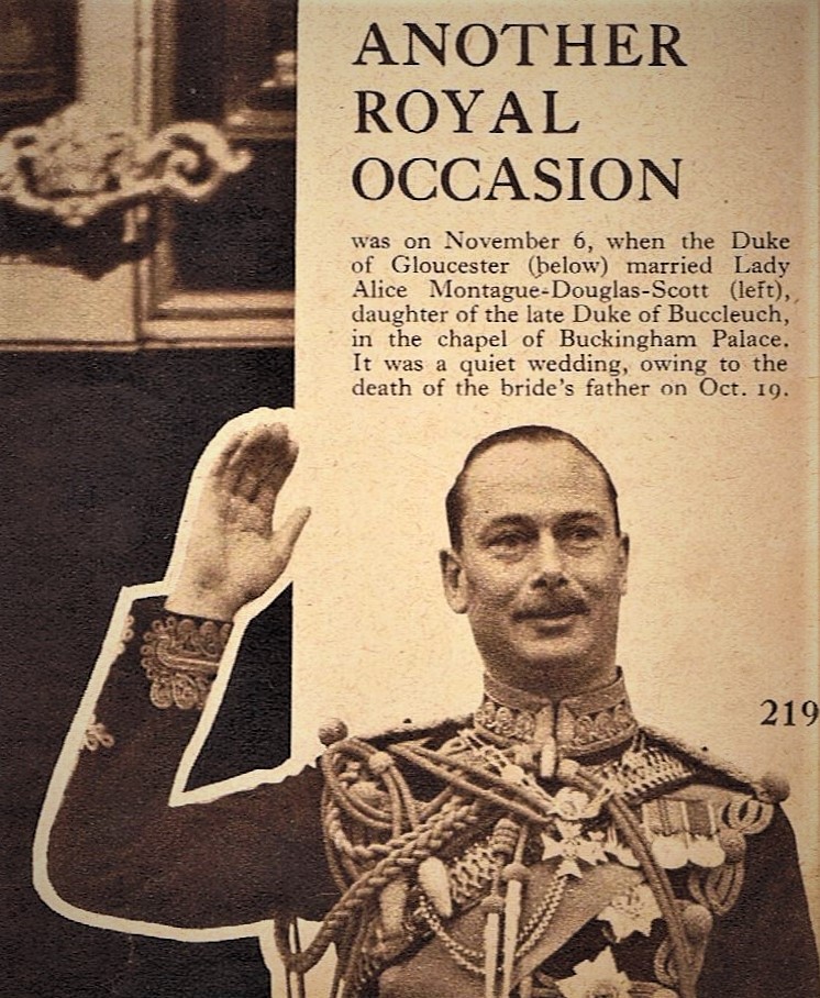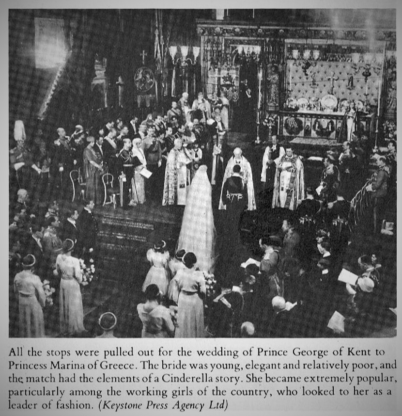 This was the wedding in the Abbey. Just above the bride can be seen, in dark uniform, the boyish-looking Prince George (later Duke of Kent), beside Queen Mary and King George V. The then Prince of Wales is standing just behind the altar rail, with the Duke of Gloucester behind him.