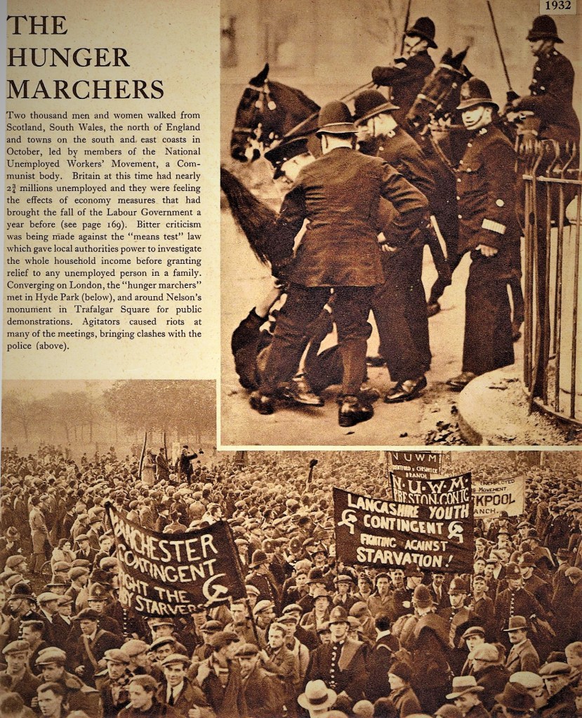 The worst year in ‘the slump’ for the entire country was 1931 (though for the ‘depressed areas,’ it was 1933, see below). Early in that year, the whole European credit system sustained a near-fatal jolt when the Austrian bank, Kredit Anstalt, failed and had to be shored up with a loan from, among others, the Bank of England. There had been a steady drain of gold from the bank ever since the American loans had ceased to flow into Central Europe. A British Government report had just been published which showed that it was overspending by a hundred and twenty million pounds a year, so when the Bank of England asked New York bankers for a loan, they refused until Britain had taken steps to balance its budget. Without the loan, the Bank would have to default on its obligations, resulting in Britain going off the gold standard. A programme of drastic cuts in Government expenditure was the only alternative, and some senior members of the Cabinet made a plan to reduce the pay of the armed services, civil servants and teachers and to cut unemployment benefits by ten per cent.