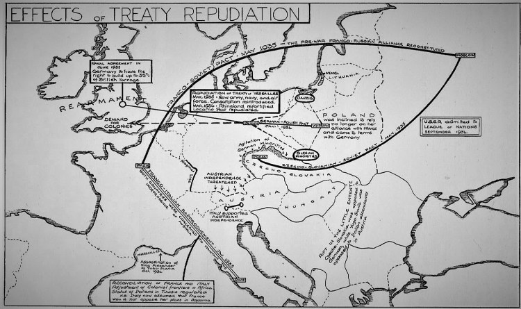 The Locarno Treaty had been the ‘high-water mark’ of the attempt to reach a guarantee of collective security in Europe between the wars. The map below suggests how the Paris Peace Settlement failed completely to satisfy the needs of Europe. By 1935, not only had the defeated state of Germany openly repudiated the restrictive clauses of the Treaty, but the victor states, recognising that the collective security of the League Covenant was uncertain, reverted to pre-War methods of forming alliances and piling up armaments. Two countries, Italy and Japan, had already undertaken military conquests in defiance of solemn treaty promises. The main causes of these developments were the rise of Nazi Germany and the growth of militant Fascism under Mussolini in Italy. In addition to Hitler’s repudiation of the Treaty of Versailles, one principal development was that Anglo-German Rivalry had reappeared in the German demand for colonial territory.