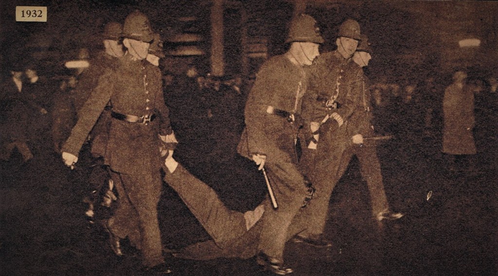 That night, they marched on Parliament with a petition containing a million signatures protesting against the means test. Thousands of onlookers gathered at Westminster, Whitehall and Charing Cross. Fireworks were thrown into the crowds, and a man with an iron bar tried to hit a mounted police officer, pictured below. Parked cars were overturned, windows broken, and fifteen people were injured. The railings of Hyde Park were torn up and found lying on the pavement the next morning. The hunger marchers cost London dearly; apart from police maintenance during their stay and the vandalism caused, the genuine unemployed among them went home by rail at a special rate of three miles a penny.