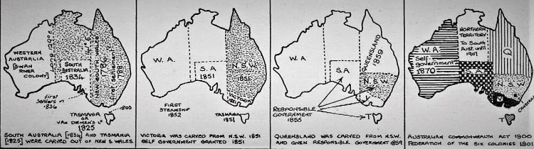 Stages in the formation of the Federation of the Six Colonies & Commonwealth of Australia to 1901.