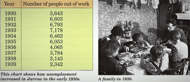 By the end of 1930, unemployment in Britain had more than doubled from one million to 2.5 million, equivalent to one in five of the workforce. It continued rising to three million by 1932 and then never dropped much below the two million mark until the rearmament programme at the end of the decade. For many people, especially in the heavy industry towns of the North of England, Scotland and Wales, unemployment became a permanent way of life, sometimes for whole communities like Jarrow and Merthyr (see the table below). Even the royal family felt the need to make sacrifices and to be seen to do so. These were largely symbolic, however.