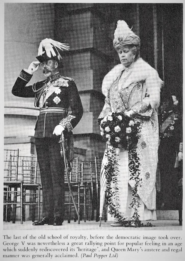 If George V was unmistakably royal, Queen Mary was regal. Tall and impressive and very dignified, she had the royal attribute of appearing to be the one fixed point in a reeling universe. Her skirts had remained ankle-length, and she wore a splendid kind of hat called a ‘toque’ which was neither fashionable nor unfashionable but simply outside of all such considerations. The Queen was a woman of considerable taste, and her personal raids on the art and antique shops were famous. Both the monarch and his Queen Consort were supremely good at their jobs.