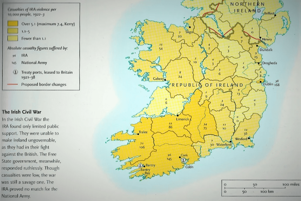 Nevertheless, it cost the lives of Arthur Griffith and Michael Collins, Commander-in-chief, among many others on both sides, with the Southwest and Dublin City the worst affected areas, as shown on the map above.