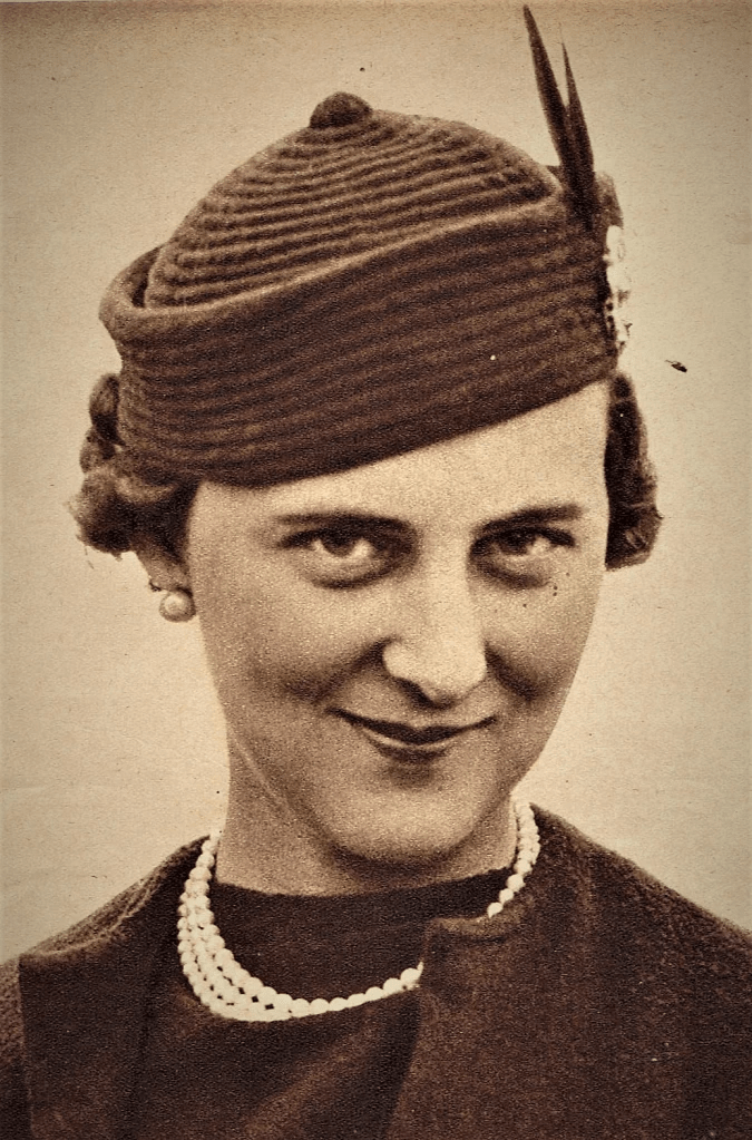 Princess Marina became engaged to George V’s youngest son, Prince George of Kent, while he was on holiday in Greece. Granddaughter of King George of Greece, who was the brother of Queen Alexandra, Princess Marina came to England in September; during the next few months, the most popular hats sold were copies of hats worn by the princess. One of her favourites was a perky pill-box with a little upstanding feather at the side, which she wears in this picture.