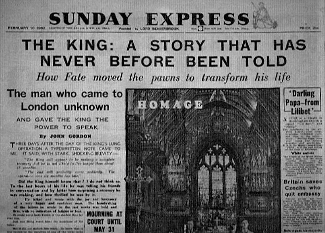 From 9 February George VI’s coffin rested in St Mary Magdalene Church, Sandringham, before lying in state at Westminster Hall on 11th February. After the King’s death and ahead of his funeral on the 15th, the newspapers gave a dramatic spin to the story, not then widely known, of his relationship with the King: