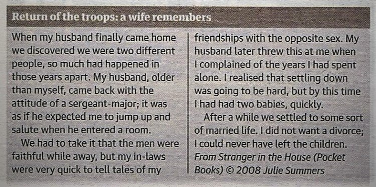 British women of all classes were hectored constantly by the government to make do and mend rather than buy new clothes. In the next decade, their daughters would revolt against the effects of this drabness. Warfare had also changed marital relationships and many women found themselves feeling estranged from their returning husbands, as revealed in the following personal account: