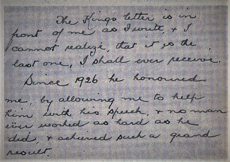 ‘Since 1926 he honoured me, by allowing me to help him with his speech & no man ever worked as hard as he did, & achieved such a grand result. During all those years you were a tower of strength to him & he has often told me how much he has owed to you, and the excellent result could never have been achieved if it had not been for your help. …’
