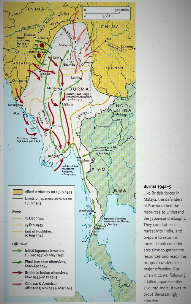 A limited offensive in Arakan in December 1942 was unsuccessful, but operations by ‘Chindit’ forces behind Japanese lines from February to April 1943 showed at least that Allied forces could master jungle fighting as effectively as their enemies. When Japanese forces, at last, launched a major offensive against Kohima and Imphal from April to June 1944, intending to create a defensive position in the Naga Hills on the Assam border, British and Indian forces were able to reply with a crippling counter-attack. After hard fighting, the offensive brought the recapture of Mandalay in March 1945 and Rangoon in May and the ambushing of three Japanese armies as they tried to escape into Siam.