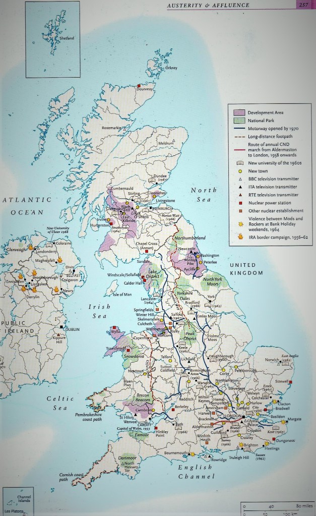 Superficially, the thirteen years of Conservative rule … appear to have been fairly successful ones. … at home people experienced ‘the affluent society’… After years of austerity they could afford to relax, and if they spent their money on bingo or beer, who could blame them? Had they not risen to the most supreme of challenges in the World War and had they not, therefore, earned the right to take things easy for a while and to take advantage of the opportunities which Macmillan’s hire purchase scheme offered them? … Everyone from the middle-aged mum with her domestic appliances to teenagers with their transistor radios agreed on that; besides, was there anything with adopting the lifestyle of the television set or movie screen? The public evidently thought not. …