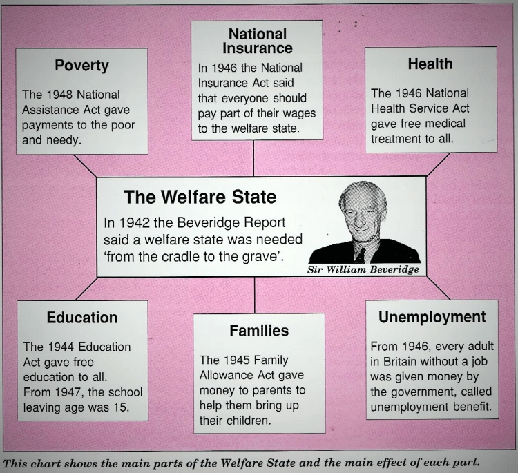 But it was out of total war and all its horrors, enormous hope was born, and the idea of a New Jerusalem wasconceived. From 1945 to 1951, the Labour Governments attempted to implement a number of radical reforms, often (but not always) opposed by the Conservatives. The new optimism can be traced back to the publication of the Beveridge Report in November 1942, which coincided with the ‘turning of the tide’ in the war at El Alamein. The first symbolised the idealism of social reconstruction, while the latter was seen as the beginning of the road to total victory. There was unanimous agreement about two things. First, there should be no repeat of the fiasco which followed the previous war – a nightmare of slump, unemployment and distress. Secondly, a set of very basic requirements was laid down: work for all, social security, a right to a decent standard of living, and genuine international cooperation. Famously, Beveridge wrote in his report: