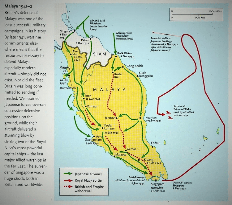 British troops were outflanked and forced into a series of retreats. They attempted to make a stand in central Malaya, around Kampar, but the area was overrun on 2nd January, just before reinforcements arrived from Singapore. When these troops finally arrived, they added to the scale of the disaster: the attempts to hold onto Singapore proved hopeless since there were no landward defences worthy of the name. British forces in Malaya finally surrendered to a much smaller Japanese force that had suffered trivial casualties, after a campaign of just fifty-five days.
