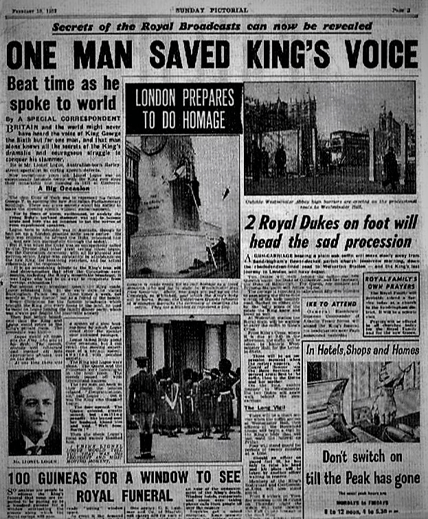 By this time, Elizabeth and Philip had reached the Kenyan stage of their trip: they had just returned from Sagana Lodge, a hundred miles north of Nairobi after a night spent at Treetops Hotel when word arrived of the King’s death; it fell to Philip to break the news to his wife. She was proclaimed Queen and the Royal couple quickly returned to Britain. On 26th February, Lionel Logue wrote to the King’s widow who, at the age of fifty-one, had just begun what was to be more than half a century as Queen Mother. He paid tribute to both their Majesties:
