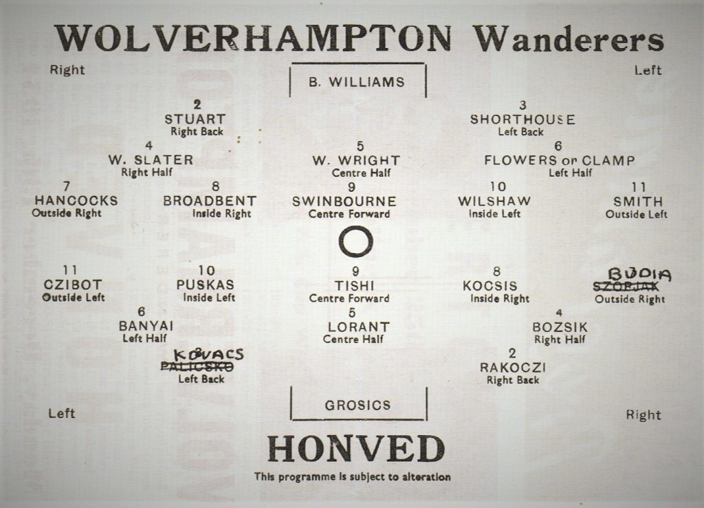 The full teams who ran out at Molineux behind the captains, Wright and Puskás, were: