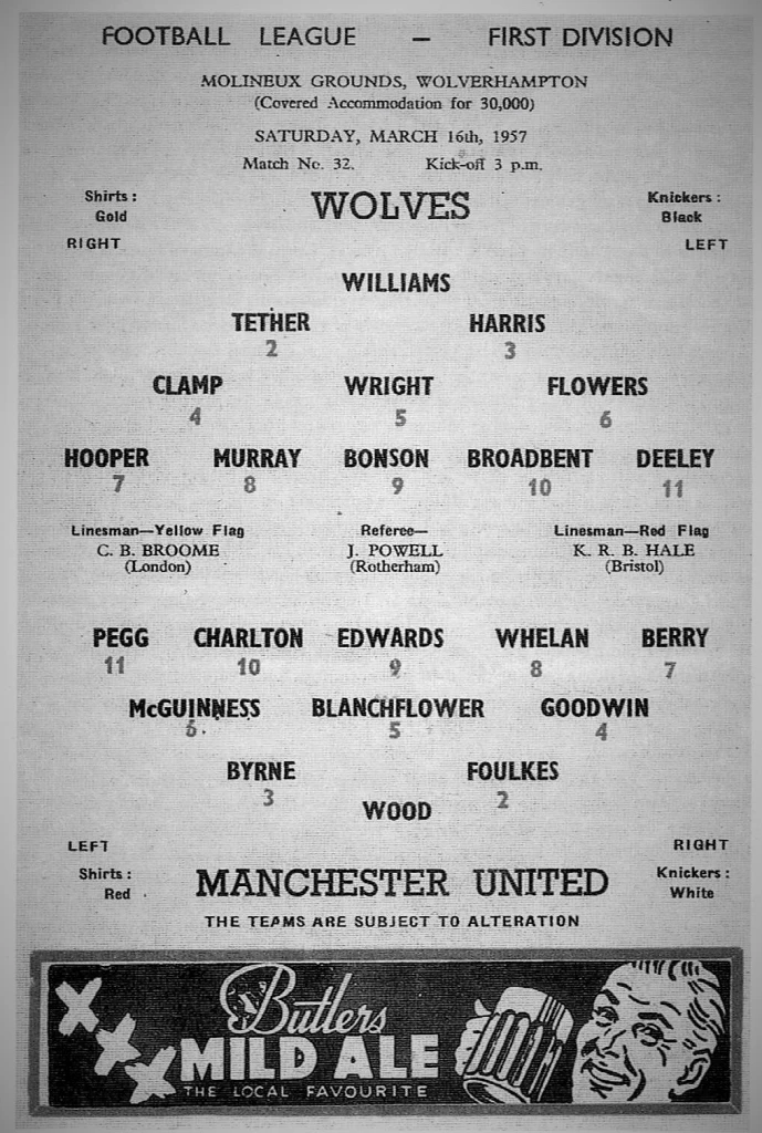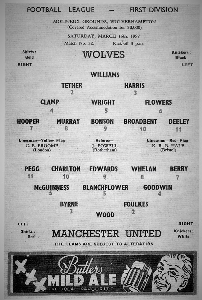 Wolves: Williams; Stuart, Shorthouse; Slater, Wright, Flowers; Hancocks, Broadbent, Swinbourne, Wilshaw, Smith.