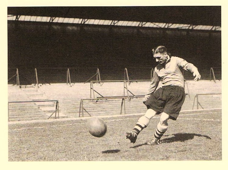 In the second half, however, the Wolves called upon all their fighting spirit and energy reserves. During the interval, the Wolves manager, Stan Cullis, ordered the pitch to be watered again (it had been watered, as usual in winter, before the match). This prevented the pitch from freezing and becoming dangerous to the players. However, the softer surface conditions suited the Wolves’ long-ball playing style more than the short-passing style of the visitors. Johnny Hancocks (above) scored from a penalty soon after the re-start, and, with fifteen minutes left, and the Hungarians tiring on what had become a very muddy pitch, Roy Swinbourne (below) scored twice to win the match 3-2 in a second half televised live throughout Britain, with many national servicemen watching it in their barracks (including my cousin, John Hartshorne). Graham Hughes explained how the morale of one group of National Servicemen was boosted by the victory: