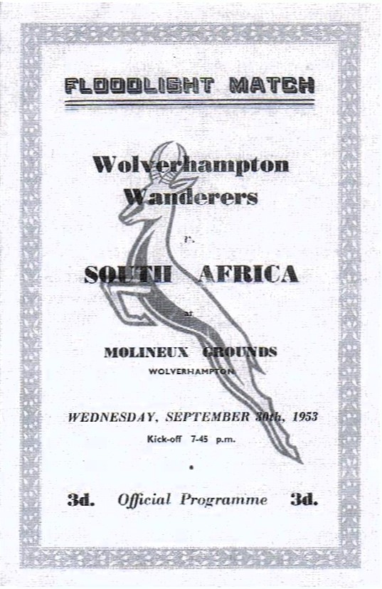 The first floodlit match took place a fortnight earlier, on 30 September, against the touring South African team, a game originally scheduled for the afternoon of that day. The honour of playing the very first floodlit game had originally been promised to Celtic, but the system, designed by W. G. France’s Electric Ltd. of Darlaston on the dining table of the Managing Director’s Bilston home, using a scaled model, was ready for use in advance of the prestigious match against the South African tourists. The Wolves board were keen to make the inaugural floodlit match as grand an affair as possible and therefore had the idea to switch the match against South Africa from what might have been, given the inclement late summer weather, a dull Wednesday afternoon fixture, into something that would live in the memory of all who witnessed it.