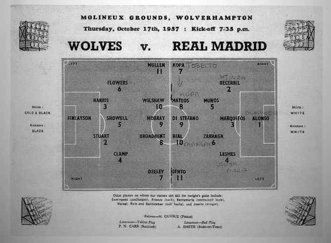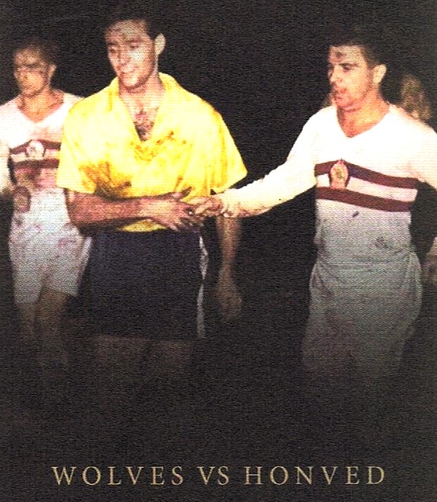 The game was played under the new floodlights on a Monday night, 13th December, with 55,000 cheering fans watching at the ground and many more on the new phenomenon of TV. The BBC broadcast the second half live on TV, and the whole match live on the radio. Just as they had led out their national teams in the games the previous season, Billy Wright and Ferenc Puskás were again side-by-side as the two teams ran out onto the pitch, Wolves wearing their golden rayon shirts to reflect the floodlights (pictured below). Billy Wright would have been fully aware of the threat Honvéd posed, having captained England games in the two heavy defeats to Hungary.