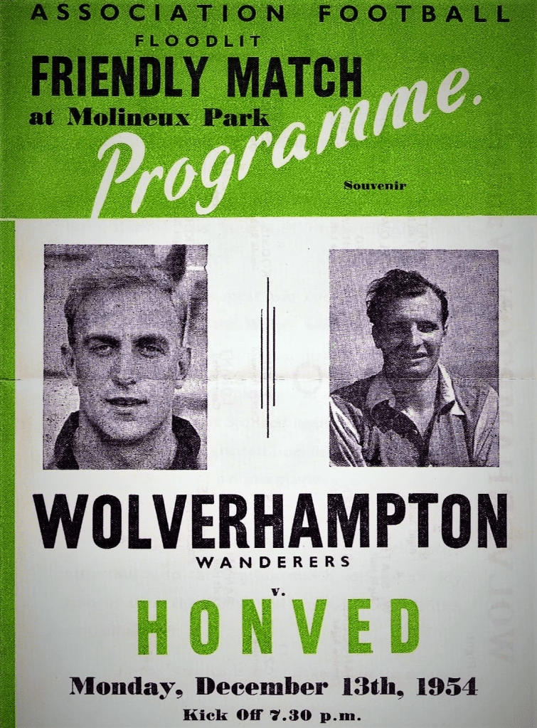 To understand the significance of the early floodlit matches, it is important to understand the peculiar social and political context and circumstances of this period of the Cold War, specifically 1953-58. The Hungarian national side, already Olympic Champions in 1952, should also have won the World Cup in the Summer of 1954, held in Switzerland, but were beaten in the final by a West German side which came from 2-0 down to win 3-2. Kocsis was the leading scorer in the World Cup and so, following their own sensational win over Spartak Moscow a month earlier, Wolves were keen to welcome the tormentors of England to Molineux. Since the England team did not meet the ‘Mighty Magyars’ in the finals (they were knocked out by Uruguay in the quarter-finals), this club match at Molineux the following December was billed as the ‘chance for revenge’ by Billy Wright and his boys.