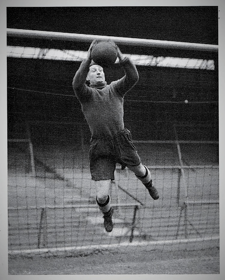 This was followed by a match against Spartak Moscow on a foggy Wolverhampton evening of 16 November and was broadcast live by the BBC. Spartak had recently crushed two of Belgium’s finest sides, Liége and Anderlecht, and a week earlier had beaten Arsenal 2-1 at Highbury, so Wolves knew that they were in for a tough night. The Wolves captain, Billy Wright led his side out clad in their new fluorescent rayon strip of gold shirts and black shorts. But the visitors began playing enthusiastically and panache, moving the ball around with great skill. Twice it had to be cleared from the goal line with Bert Williams beaten, but the Wolves goalkeeper (pictured above) saved several more good attempts on his goal.