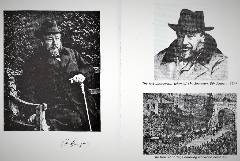 For the burial, Spurgeon’s body was returned to London from the south of France, where he had died. The greatest crowds ever seen in the Tabernacle were on 8 February 1892, when Spurgeon’s body lay ‘in state’. Over sixty thousand people passed before the coffin, and a similar crowd again the next day. On the 10th, the day of the funeral, the building was filled to overflowing. His body was interred at Norwood Cemetery the following day, with thousands lining the streets to pay their respects as the cortege passed by on its route, as pictured below (bottom right).