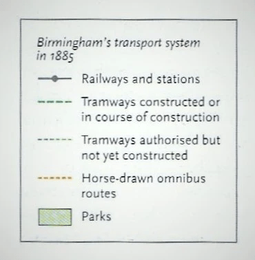 Together with the west Midland industrial towns, which also became strongholds of radical religious Dissent, Birmingham was becoming overtly political with the rise to municipal power of Chamberlain’s Liberal reformers. They set about their reforming projects and programmes with a zeal reminiscent of the evangelical campaigns of the earlier part of the century. The city rapidly gained a reputation for municipal enterprise for its public works, including one of the country’s most extensive urban tramway systems (see the map above). Cheap and efficient public transport systems, based on horse-drawn omnibuses and trams, proved to be an effective way of dispersing the industrial working class from overcrowded and disease-ridden city-centre slums. The now radicalised diarist, Beatrice Webb, commented on her conversations with him on these social themes in her diary, in entries made during their four-year relationship which had begun in 1882 when he had become a minister in Gladstone’s second government: